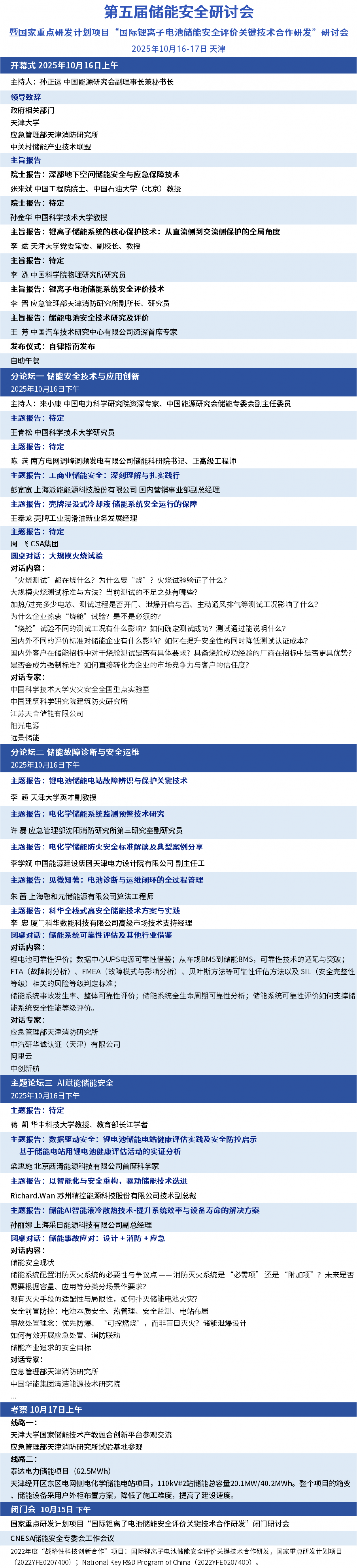 由中关村储能产业技术联盟、应急管理部天津消防研究所、天津大学国家储能技术产教融合创新平台主办的第五届储能安全研讨会暨国家重点研发计划项目“国际锂离子电池储能安全评价关键技术合作研发”研讨会,将于2025年10月16-17日在天津召开。