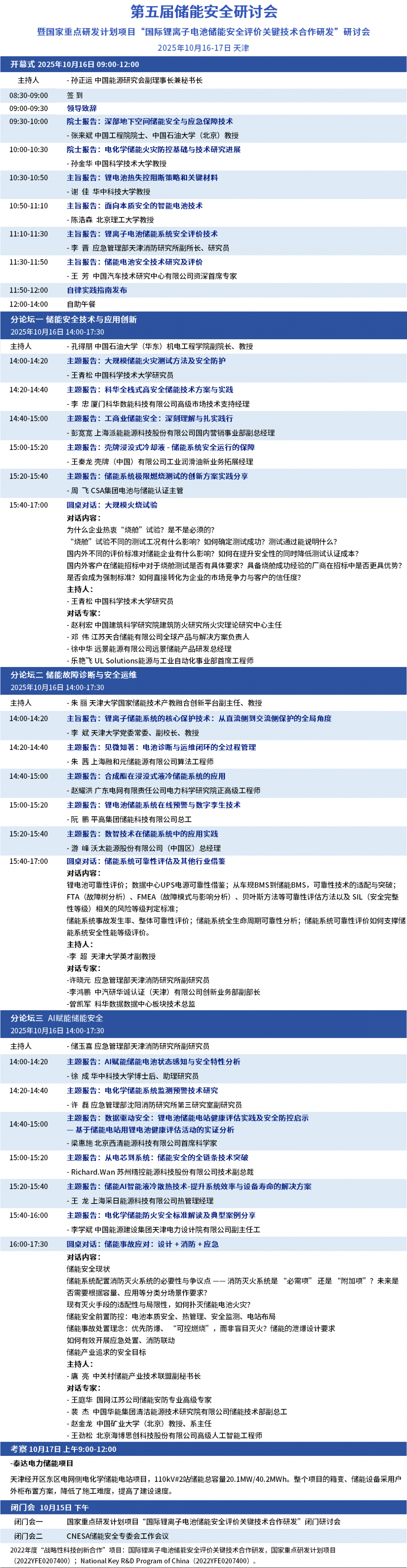 由中关村储能产业技术联盟、应急管理部天津消防研究所、天津大学国家储能技术产教融合创新平台主办的第五届储能安全研讨会暨国家重点研发计划项目“国际锂离子电池储能安全评价关键技术合作研发”研讨会,将于2025年10月16-17日在天津召开。