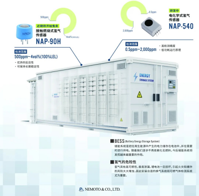 深耕储能领域,针对氢⽓检测核⼼需求,NEMOTO 创新推出接触燃烧式氢⽓传感器 NAP-90H。该产品兼具优异的反应速度与⻓期稳定性,检测范围覆盖 1ppm ⾄100vol%,可全⾯匹配 BESS(电池储能系统)的氢⽓监测需求。