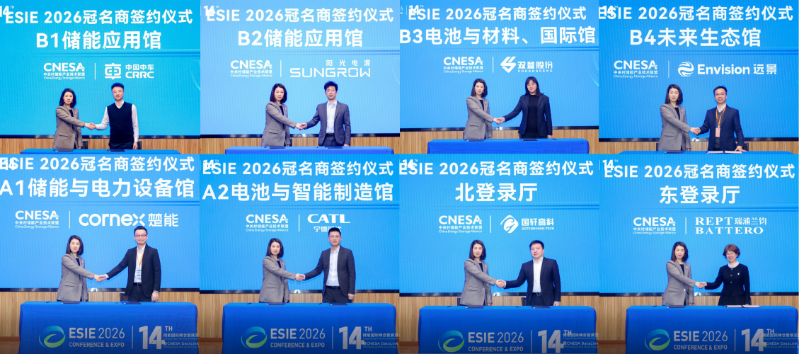 发布会上,ESIE 2026与中车株洲所、阳光电源、双登股份、远景储能、楚能新能源、宁德时代、国轩高科、瑞浦兰钧八家行业龙头企业签署了冠名商合作协议,各方将依托ESIE平台,携手推动储能产业高质量发展与生态共赢。