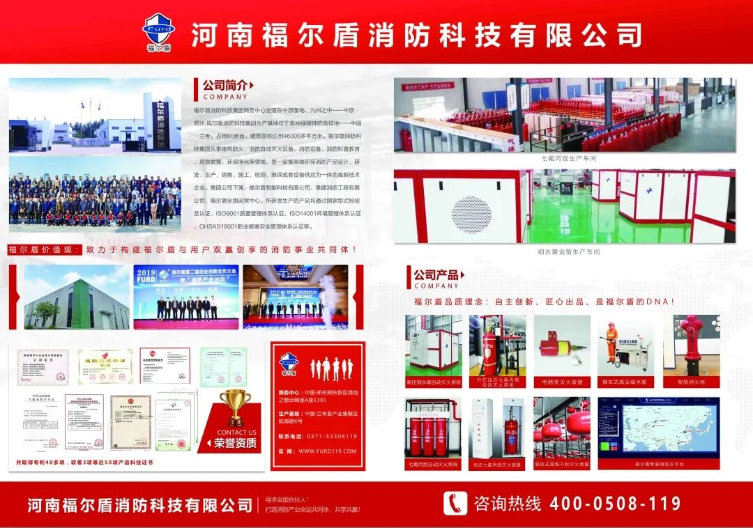 河南福尔盾消防科技有限公司创始于2011年,研发和市场运营中心坐落在国家中心城市中原郑州;生产基地坐落在焦裕禄精神发祥地(红色教育基地)—开封兰考产业集聚区。是一家集消防产品设计、研发、生产、销售、施工、检测维保、成套设备供应、物联网技术为一体的国家级高新技术企业。主要从事建筑防火、智能自动灭火系统、消防装备、消防科普教育、消防物联网传感装置、应急救援装备、环保净化等领域。