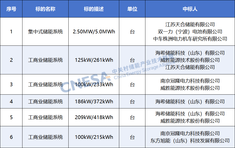 天合储能、双一力、中车株洲所、冠隆电力、东方旭能、海希储能、威胜能源等企业中标。