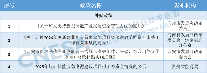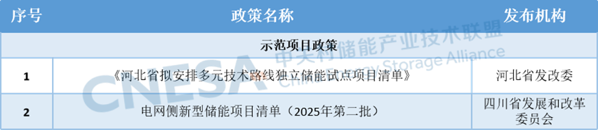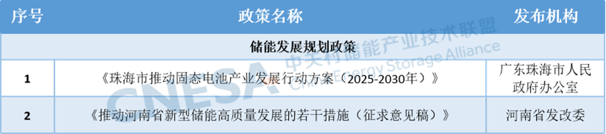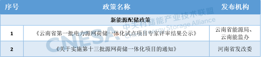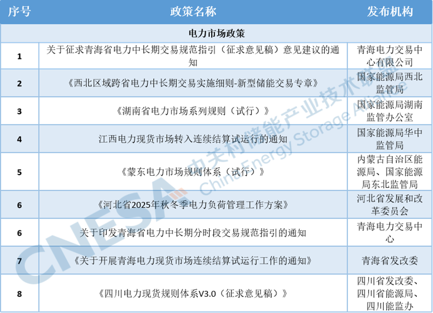 新能源配储方面 云南省能源局、国家能源局云南监管办发布《云南省第一批电力源网荷储一体化试点项目专家评审结果公示》,本次入选三个项目,共建设光伏22万千瓦,风电25.875万千瓦,配置储能85MW/170MWh。 河南省发改委发布《关于实施第十三批源网荷储一体化项目的通知》,此次共45个项目纳入实施范围,其中,工业企业类29个、增量配电网类1个,农村地区类5个、其他类7个及3个信息变更。总规模350.82MW,其中风电200.95MW、光伏149.87MW。 电力市场方面 青海电力交易中心有限公司发布关于征求青海省电力中长期交易规范指引(征求意见稿)意见建议的通知,规定电力中长期交易现阶段主要开展电能量交易、绿色电力交易,灵活开展合同转让、合同变更交易等。可以采用双边协商交易、集中交易两种方式进行。 国家能源局西北监管局发布《西北区域跨省电力中长期交易实施细则-新型储能交易专章》,对参与新型储能交易的经营主体、交易方式、交易组织、计量结算等方面作出规定。 国家能源局湖南监管办公室发布《湖南省电力市场系列规则(试行)》,其中包含湖南省电力中长期交易实施细则、湖南省电力现货市场交易实施细则、湖南省电力调频辅助服务市场交易实施细则等6项交易规则。 国家能源局华中监管局发布江西电力现货市场转入连续结算试运行的通知,规定江西电力现货市场自2025年10月1日起,转入连续结算试运行。同时,结合江西新能源消纳形势首次将市场价格下限降至-0.1元/千瓦时,进一步挖掘电网调峰能力。 内蒙古自治区能源局、国家能源局东北监管局发布《蒙东电力市场规则体系(试行)》,包含“1+8”系列规则,即1个基本规则和8个实施细则。 河北省发展和改革委员会发布《河北省2025年秋冬季电力负荷管理工作方案》,持续扩大需求响应资源池,引导用户侧储能、工业弹性检修、自备电厂等柔性负荷资源纳入需求响应资源池,并落实优先调度原则。 青海电力交易中心发布关于印发青海省电力中长期分时段交易规范指引的通知,规定参与的市场主体含新型经营主体(含新型储能企业、负荷聚合商、虚拟电厂等)。同时,青海省中长期分时段交易各时段申报价格的限额可统一设置为下限80元/MWh、上限650元/MWh。 青海省发改委发布关于开展青海电力现货市场连续结算试运行工作的通知,文件明确,青海现货电能量市场自2025年10月28日起开始连续试运行。 四川省发展和改革委员会、四川省能源局、国家能源局四川监管办公室发布《四川电力现货规则体系V3.0(征求意见稿)》,规则推动新能源全面参与电力市场,完善市场机制设计,促进新能源与其他各类电源公平参与市场竞争;推动分布式发电、独立储能和虚拟电厂等新型经营主体参与交易;支持“电源+储能”作为联合报价主体参与现货市场。 辅助服务方面 江苏能监办发布《江苏电力并网运行管理实施细则》、《江苏电力辅助服务管理实施细则》,备用、有偿无功调节、转动惯量、爬坡、黑启动等,将可以通过固定补偿或市场化方式提供补偿。另外,纳入输配电价管理的独立新型储能电站暂不执行运行管理考核。 国家能源局山东监管办公室发布《山东省电力并网运行管理实施细则(征求意见稿)》《山东省电力辅助服务管理实施细则(征求意见稿)》,明确了惯量响应、快速调压等补偿标准为72元/MW。 国家能源局湖南监管办公室发布《关于明确湖南省电力辅助服务市场有关事项的通知》,明确湖南省内调峰辅助服务市场价格上限不高于省平价新能源项目的上网电价450元/MWh。其中,新型储能报价限额为450元/MWh。同时在电力现货市场试运行期间,调峰辅助服务市场暂停运行,调峰辅助服务不予补偿。 电价政策方面 浙江省发展改革委发布《关于优化分时电价政策有关事项的通知(征求意见稿)》,与现行政策相比:全年上午7:00-11:00调整为平时段,下午16:00-23:00调整为高峰(尖峰)时段,午间低谷增加了一小时。浮动比例方面,尖峰、高峰、平段、低谷、深谷浮动结果比例为2.05:1.85:1:0.4:0.2。 河北省发展和改革委员会发布《关于优化调整冀北电网工商业及其他用户分时电价政策的通知(征求意见稿)》,本次征求意见稿仅对峰谷时段进行了调整,浮动比例和参与浮动项与现行政策无变化。冬季(11、12月及次年1月、2月)新增深谷时段,均在午间12:00-15:00,共3小时,在低谷电价基础上下浮20%,2月-5月、9月-10月取消上午2小时高峰时段,夏季(6-8月)尖峰时段后移1小时。 河北省发改委发布《关于优化调整河北南网工商业及其他用户分时电价政策》,与现行政策相比,新政策主要调整了分时时段的划分与峰谷时段的分布,并调整了部分用户的浮动基数,而峰谷的浮动比例,并未进行调整,并取消“执行1.5倍代理购电价格中的0.5倍加价部分不参与峰谷分时电价浮动”的说明。 补贴方面 广州市发展和改革委员会发布《关于印发支持新型储能产业发展资金管理办法的通知》,对新型储能在创新载体建设方面和项目试点示范方面分别做出了相应的奖励和补贴标准。 河南省发展和改革委员会办公室、河南省政办公室发布《关于开展2024年度新建非独立新型储能项目省级财政奖励资金审核工作有关事项的通知》,根据文件,河南省将对全省区域内新建设的新能源配建储能、用户侧非独立储能项目提供奖励。2024年度新型储能奖励标准为12