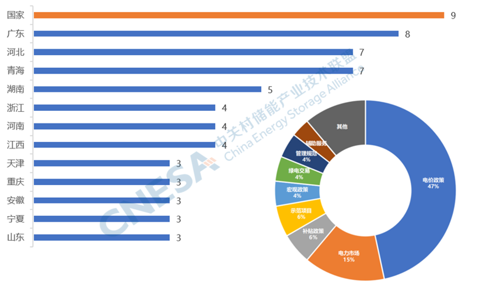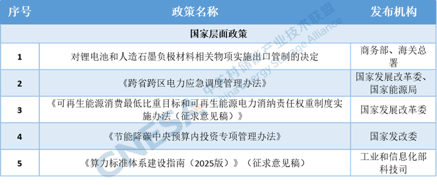 2025年10月储能政策从国家到地方共有90项发布或征求意见,涉及电价政策、电力市场、补贴政策、示范项目等方面,中关村储能产业技术联盟对本月储能政策进行了梳理解读,希望与业界同仁共同交流探讨。 一、政策数据概览 根据CNESA DataLink全球储能数据库的不完全统计,2025年9月份共发布储能相关政策90项,其中国家层面发布9项。从重要程度来看,非常重要类39项,其中,国家、广东、河北、青海发布数量居多,从政策类别来看,电价政策、电力市场政策居多。 二、重要政策概览 【国家层面】 国家商务部、海关总署发布对锂电池和人造石墨负极材料相关物项实施出口管制的决定,对锂电池相关物项和正极材料相关物项等实施管制,包括3A001 重量能量密度大于等于300 Wh/kg的可充放电锂离子电池、用于制造可充放电锂离子电池的设备等。 国家发展改革委、国家能源局发布《跨省跨区电力应急调度管理办法》,提到应急调度在受入省的落地侧电价,按省间现货市场结算价格上限或南方区域现货市场出清价格上限的最高值确定。明确了应急调度电量、电费在送出省发电和用户侧以及受入省用户侧的分配和分摊办法。 国家发展改革发布《可再生能源消费最低比重目标和可再生能源电力消纳责任权重制度实施办法(征求意见稿)》,提出将可再生能源消费最低比重和省级电力消纳责任权重制度化、年度化管理,并把非电能(供热、制氢/制氨/制醇、生物燃料等)纳入同一考核体系。 国家发改委发布《节能降碳中央预算内投资专项管理办法》,本专项支持重点行业领域节能降碳、煤炭消费清洁替代、循环经济助力降碳、低碳零碳负碳示范、碳达峰碳中和基础能力建设等方向。 国家工业和信息化部科技司发布《算力标准体系建设指南(2025版)》(征求意见稿),其中算力设施标准主要包括机房建设、新能源及储能利用、高效供电与冷却、智能运维与管理等标。新能源及储能利用标准,规范存储和利用可再生能源的技术要求和测试方法,以支持算力基础设施运行。 【地方层面】 储能发展规划方面 广东珠海市人民政府办公室发布《珠海市推动固态电池产业发展行动方案(2025-2030年)》,重点培育能量密度超350Wh/kg的半固态电池和超400Wh/kg的全固态电池项目,推动固态电池产品规模化量产落地。 河南省发改委发布《推动河南省新型储能高质量发展的若干措施(征求意见稿)》,提出到2030年,新型储能装机规模达到1500万千瓦(15GW),市场机制、商业模式、标准体系基本成熟健全,多元储能体系初步建成。并且为新型储能制定若干发展措施。