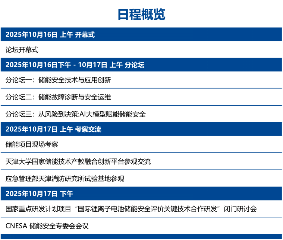 由中关村储能产业技术联盟、应急管理部天津消防研究所、天津大学国家储能技术产教融合创新平台主办的第五届储能安全研讨会暨国家重点研发计划项目“国际锂离子电池储能安全评价关键技术合作研发”项目研讨会,将于2025年10月16-17日在天津召开。