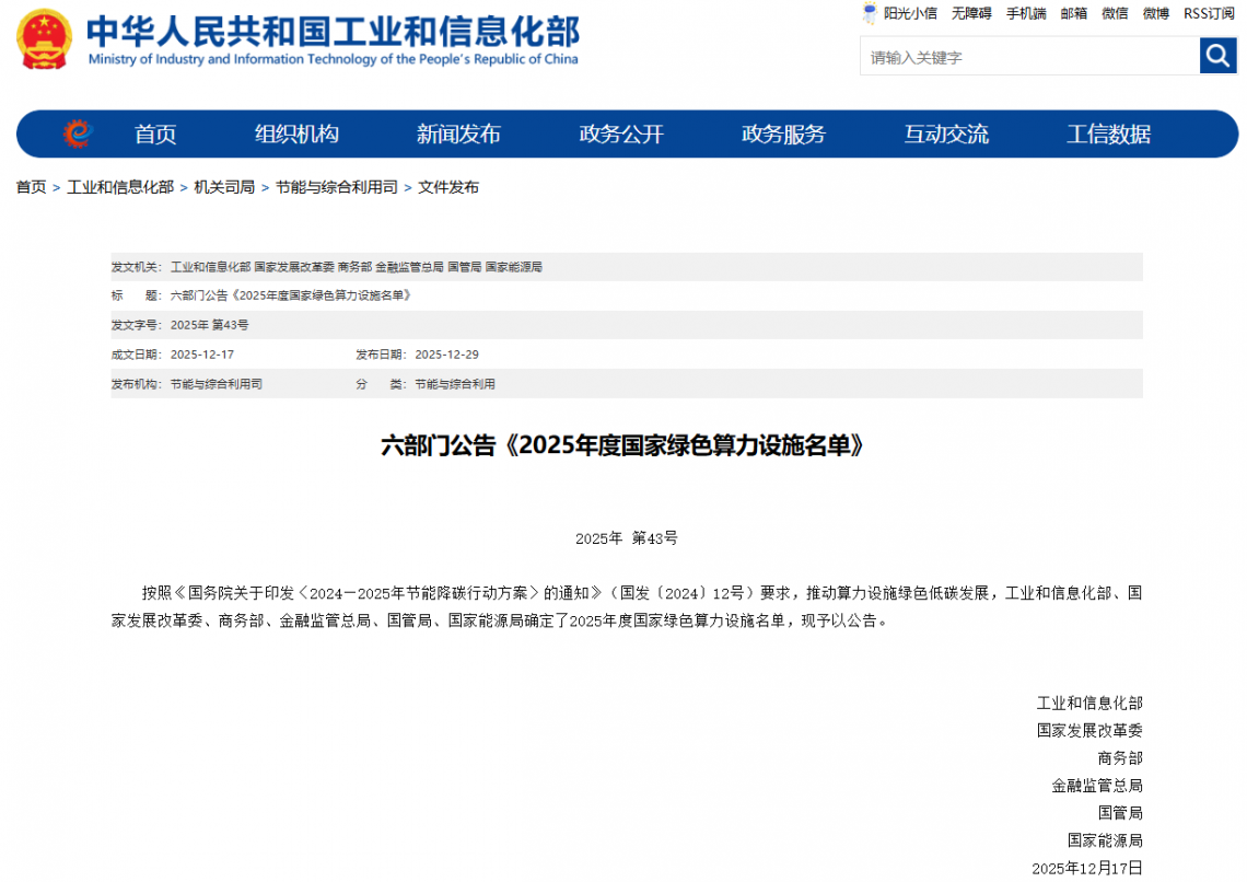 12月29日,工业和信息化部、国家发展改革委、商务部、金融监管总局、国管局、国家能源局六部门联合发布《2025年度国家绿色算力设施名单》。