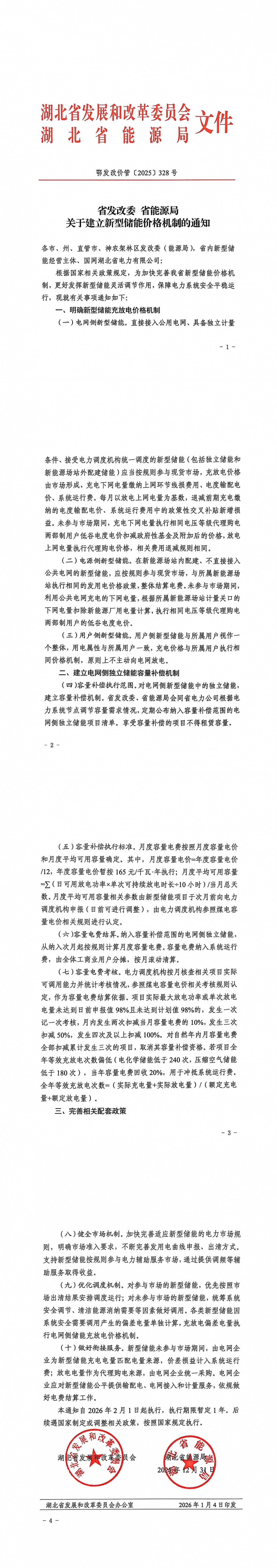 1月4日,湖北省发展改革委、湖北省能源局发布《关于建立新型储能价格机制的通知》,政策自2026年2月1日起执行,执行期限暂定1年。