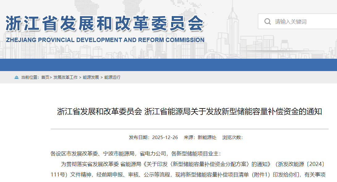 12月26日,浙江省发展改革委、浙江省能源局发布《关于发放新型储能容量补偿资金的通知》。清单显示,此次获得容量补偿的新型储能项目共17个,总规模为1.164GW,第1年补偿金额共2.328亿元。