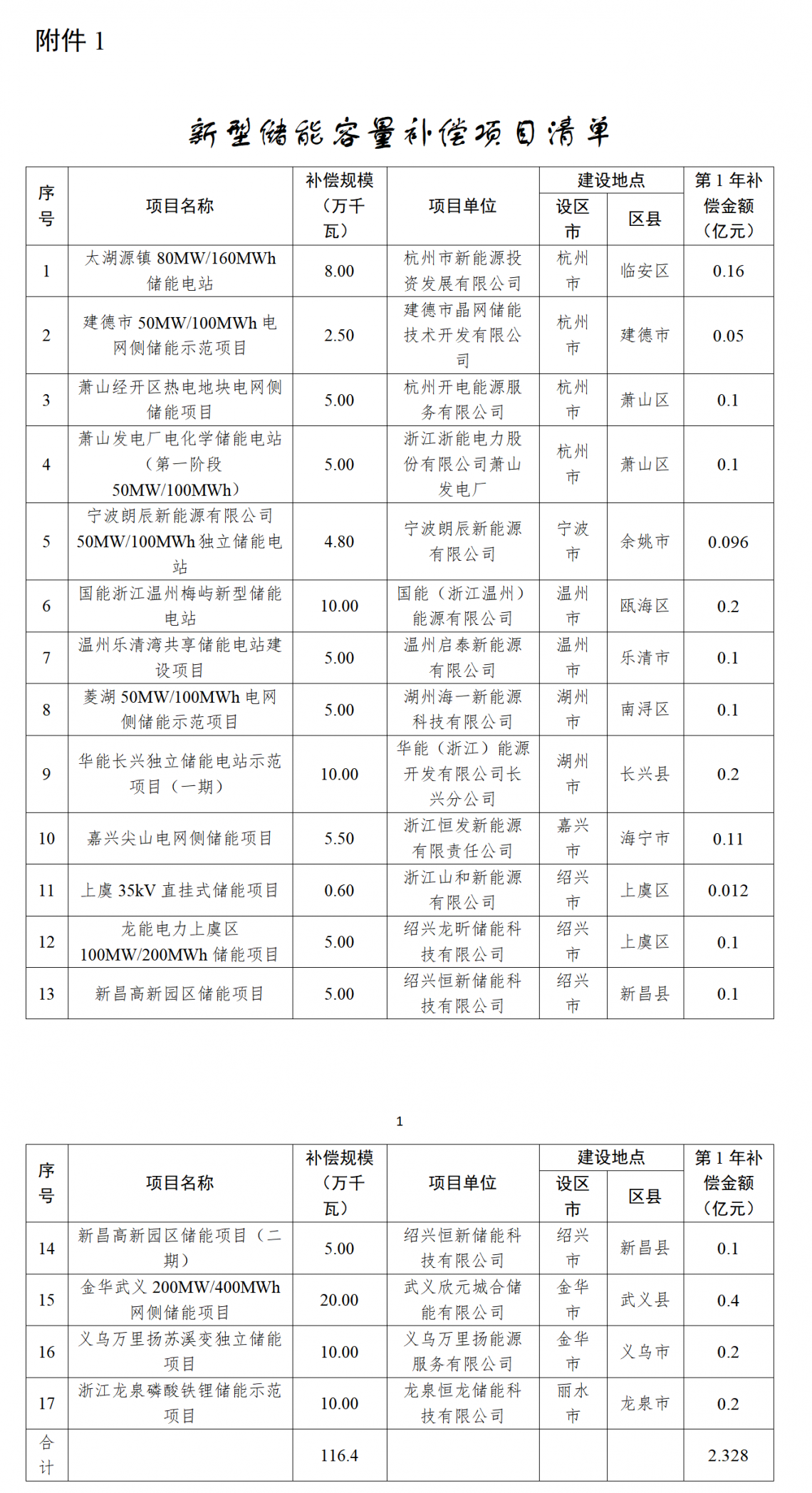 附件:1.新型储能容量补偿项目清单