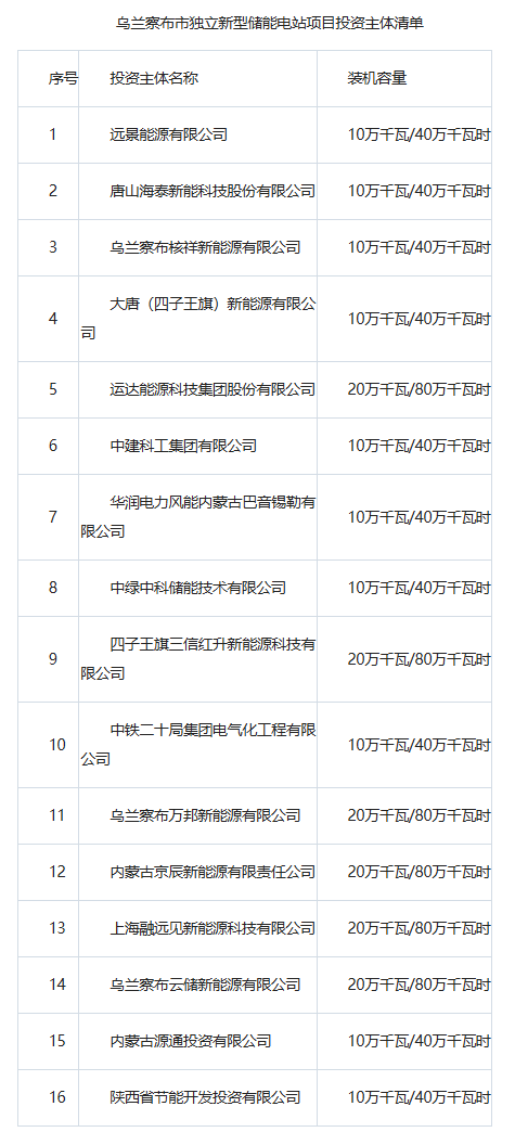 1月12日,乌兰察布市独立新型储能电站项目投资主体优选结果公示。