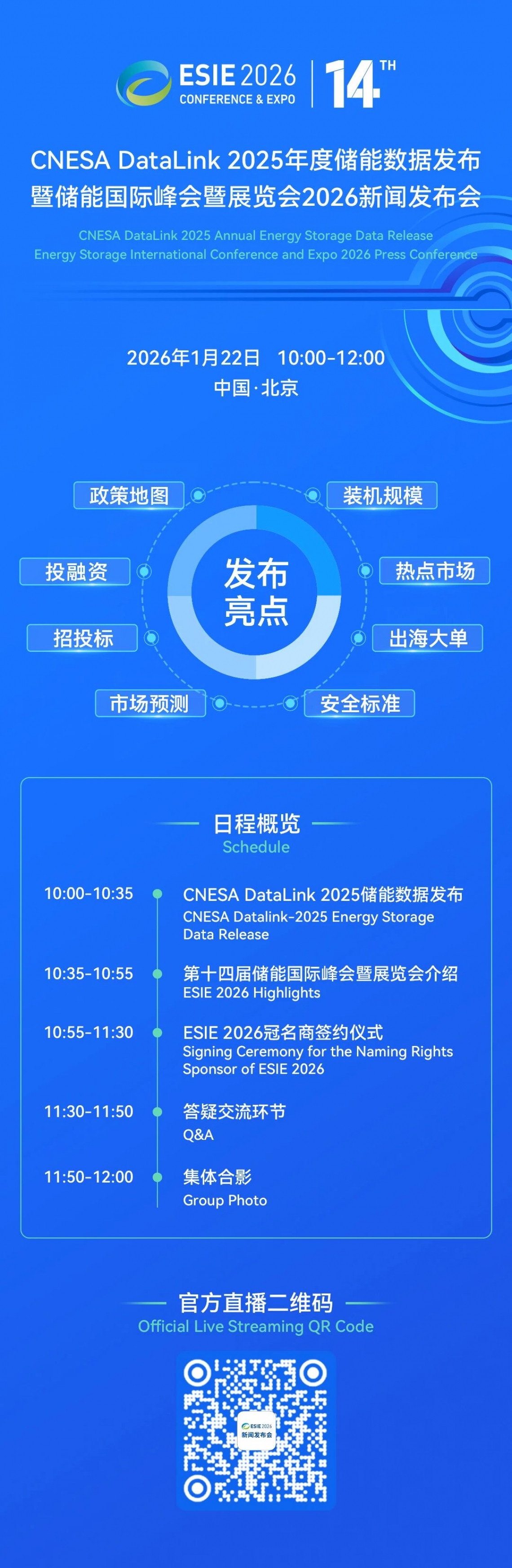 “CNESA DataLink 2025年度储能数据发布暨储能国际峰会暨展览会2026新闻发布会”将于2026年1月22日在北京召开。本次活动将从多维度全面总结2025年储能产业发展全貌,前瞻预测行业未来发展趋势;同时正式发布第十四届储能国际峰会暨展览会ESIE 2026的筹备情况。