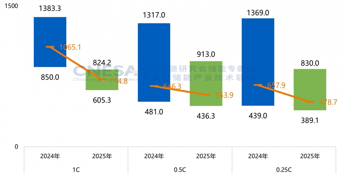 根据CNESA DataLink全球储能数据库的不完全统计,2025年储能系统(磷酸铁锂系统,不含用户侧应用)采购中标价格在391.14元/kWh-913.00元/kWh之间,其中不同时长系统价格降价幅度差异大。0.25C储能系统价格下降幅度接近0.5C的两倍。2025年EPC(不含用户侧)中标价格呈现出波动下行的趋势,2h EPC的中标均价已降至1043.82元/kWh,同比下降13.04%;4h EPC的中标均价为935.40元/kWh,同比下降8.19%。