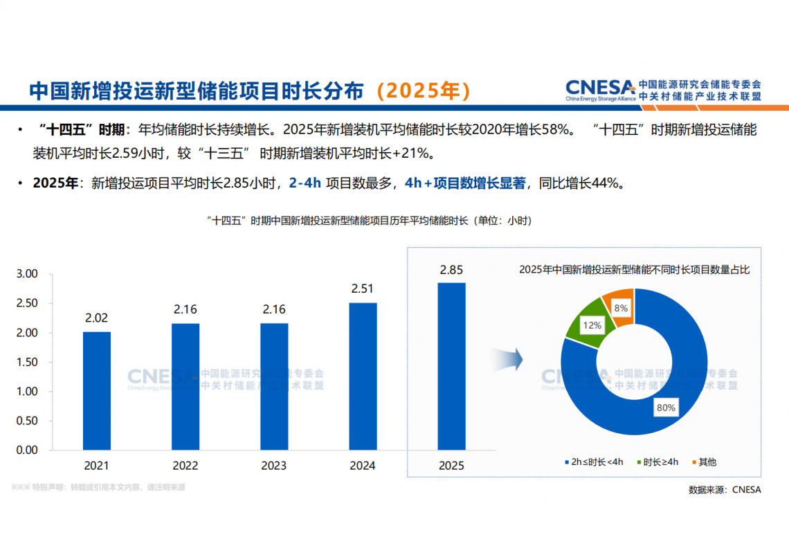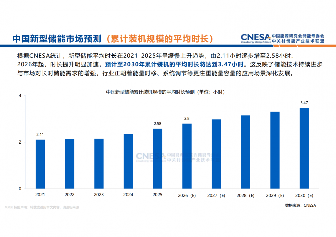 陈海生表示,新型储能累计装机的平均时长在2021-2025年呈缓慢上升趋势,由2.11小时逐步增至2.58小时。2026年起,时长提升明显加速,预计至2030年将达到3.47小时。这一转折反映了储能技术持续进步与市场对长时储能需求的增强,行业正朝着能量时移、系统调节等更注重能量容量的应用场景深化发展。
