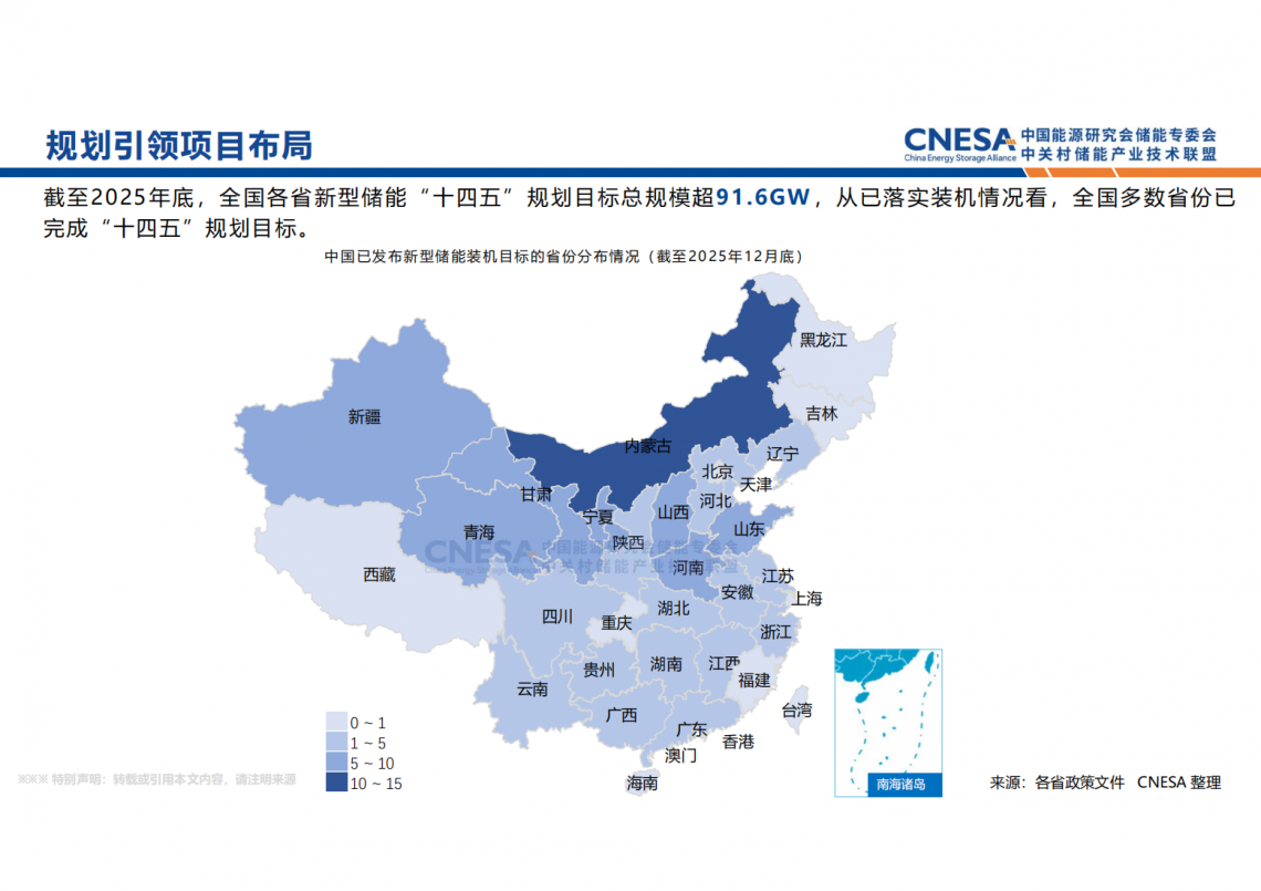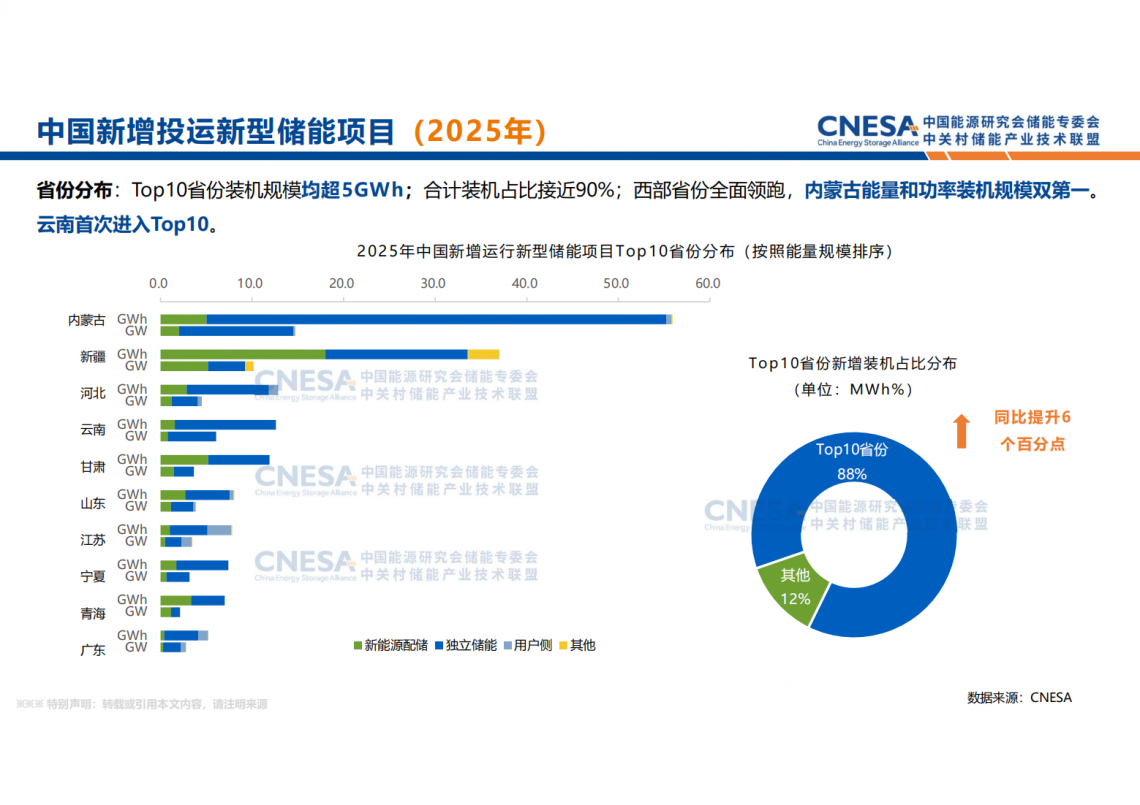 2025年中国新型储能新增投运66.43GW/189.48GWh,功率规模和能量规模同比+52%/+73%。从区域分布看,Top10省份装机规模均超5GWh,合计装机占比接近90%;西部省份全面领跑,内蒙古能量和功率装机规模双第一,超越加州成为全球第一的省份;云南首次进入Top10。