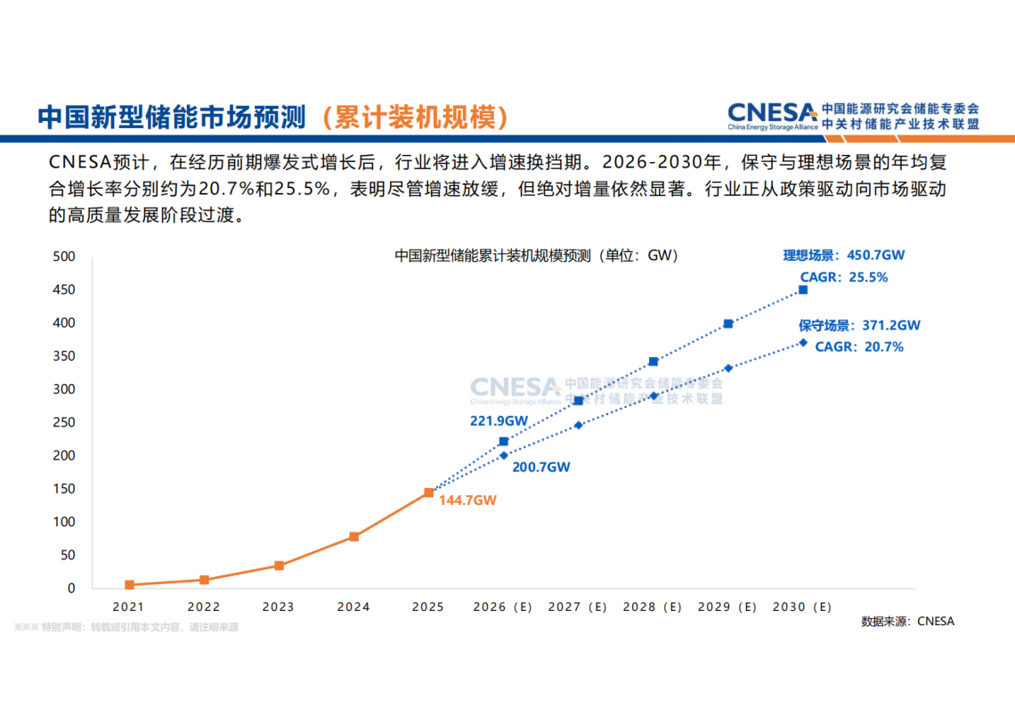 展望”十五五“,新型储能装机增速虽然放缓,但庞大的基数仍将催生可观的绝对增量,预计2030年累计装机有望达到3.7亿千瓦以上。