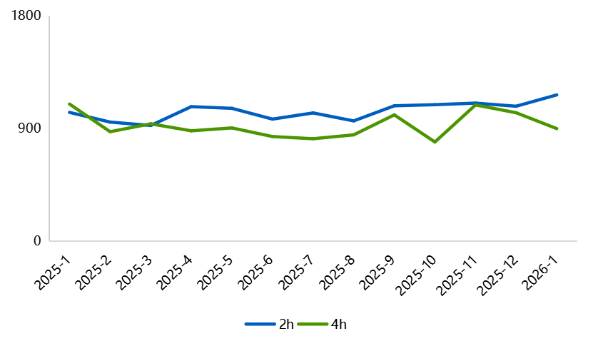 4hEPC,均价898.4元/kWh,同比-17.9%,环比-12.4%,价格区间为747.0元/kWh-998.0元/kWh,价格区间较2025年12月收窄。