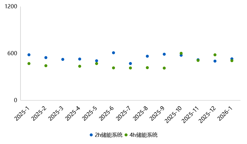 2h储能系统,均价530.9元/kWh,同比-8.9%,环比+5.8%,价格区间为489.0元/kWh-615.2元/kWh,价格区间较2025年12月上移;