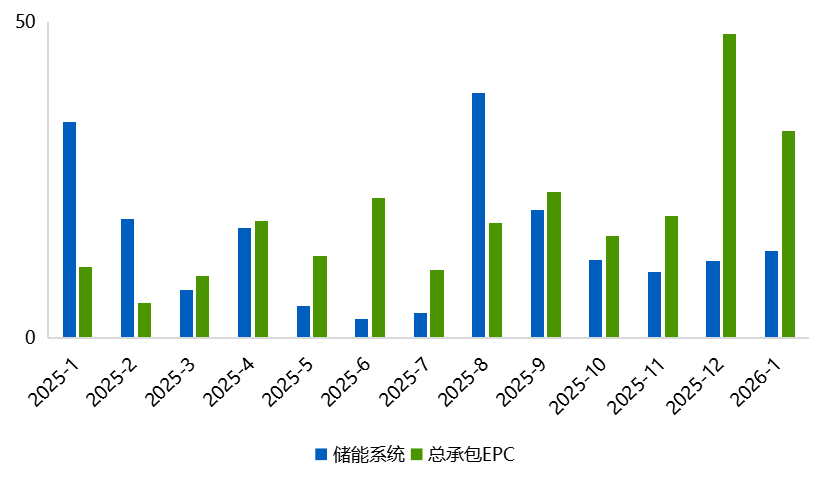 图1:2025年1月-2026年1月储能系统和EPC的中标规模情况(单位GWh)