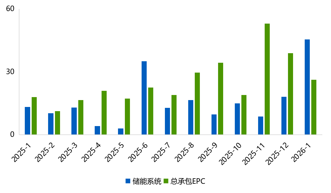 2026年1月,中关村储能产业技术联盟基于各大招采平台发布的公开信息,追踪到储能招标标段253条(同比-5.2%,环比-31.3%),项目涵盖总承包EPC、储能系统、储能电芯、电池Pack、PCS、EMS、BMS等全链条环节。1月储能系统和EPC(含PC)招标标段数量环比下降30%以上。