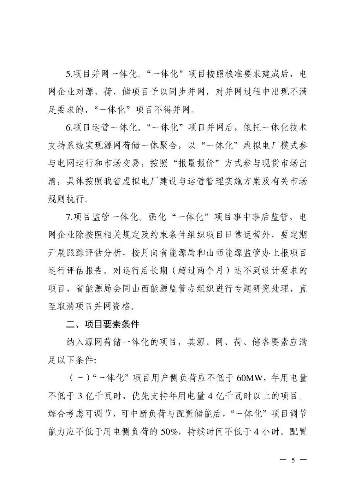 5月30日,山西省能源局官网发布《源网荷储一体化项目管理办法》。办法中提出一体化原则包含可研设计一体化、项目评估一体化、项目纳规一体化、项目建设一体化、项目并网一体化、项目运营一体化、项目监管一体化七个一体化。