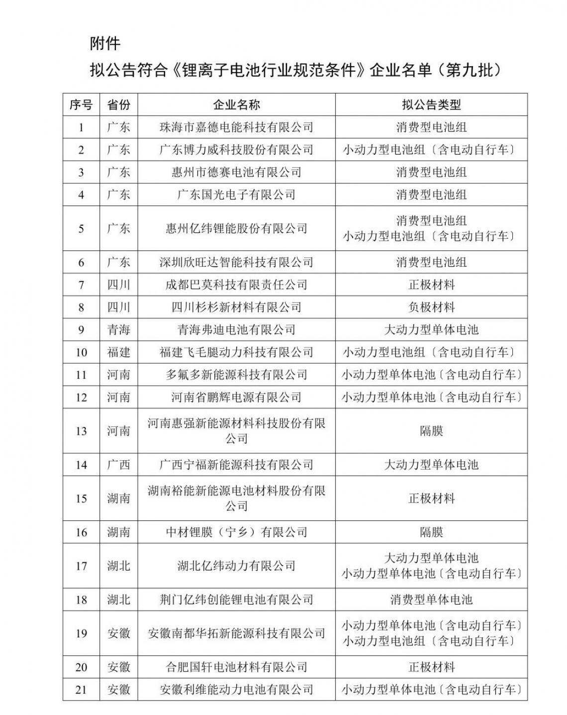 12月29日,工信部正式公示《拟公告符合<锂离子电池行业规范条件>企业名单(第九批)》,本次共计36家企业入围,申报通过数量为近期新高。