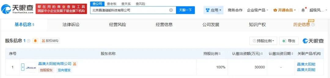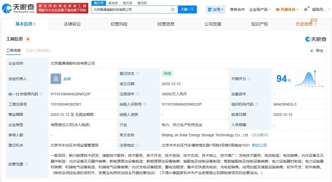 天眼查工商信息显示,12月12日,北京晶澳储能科技有限公司成立,法定代表人为金斌,注册资本3亿人民币,经营范围包括新兴能源技术研发、储能技术服务、新能源原动设备制造、新能源原动设备销售等。股东信息显示,该公司由晶澳科技旗下晶澳太阳能有限公司全资持股。