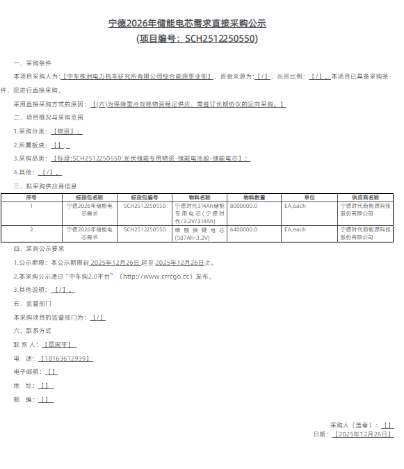 12月26日,中车发布宁德2026年储能电芯需求直接采购公示。