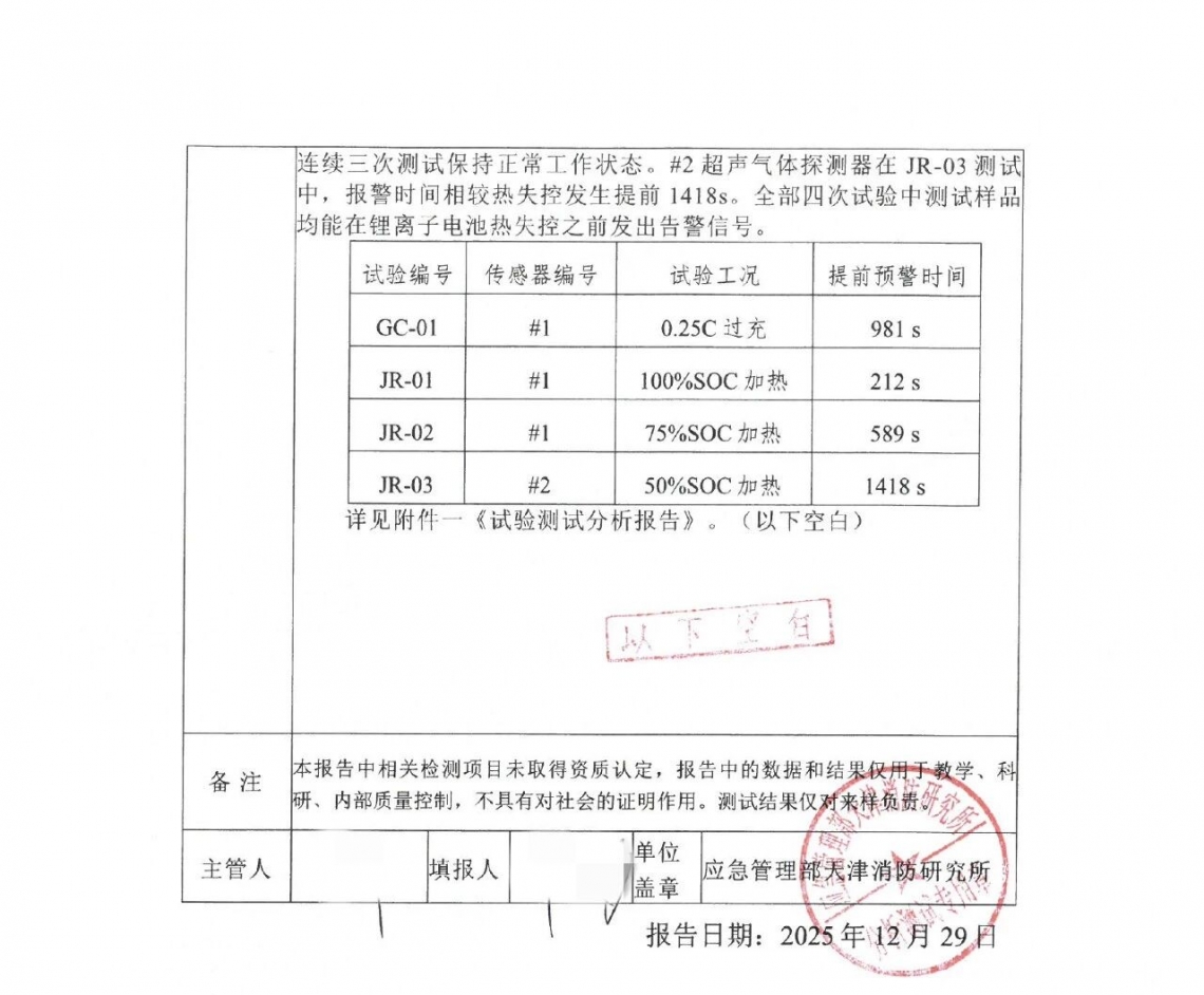 可靠性:报告显示,同一只超声气体探测器经反复热失控测试,每次均能提前正常预警,连续三次测试均保持正常工作状态,实现零误报。
