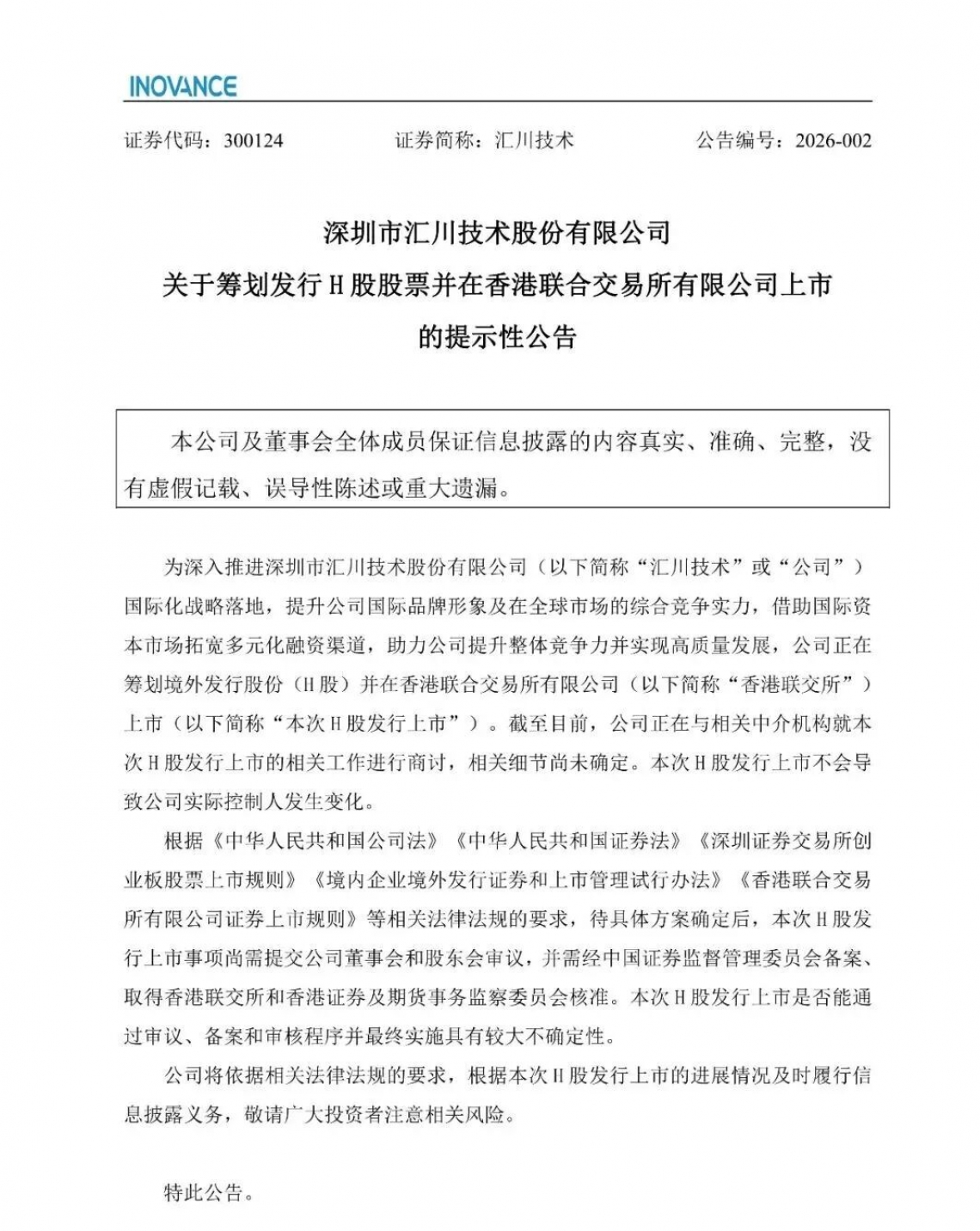 1月19日,汇川技术(300124)发布公告,公司正筹划在香港联交所主板发行H股股票并上市。