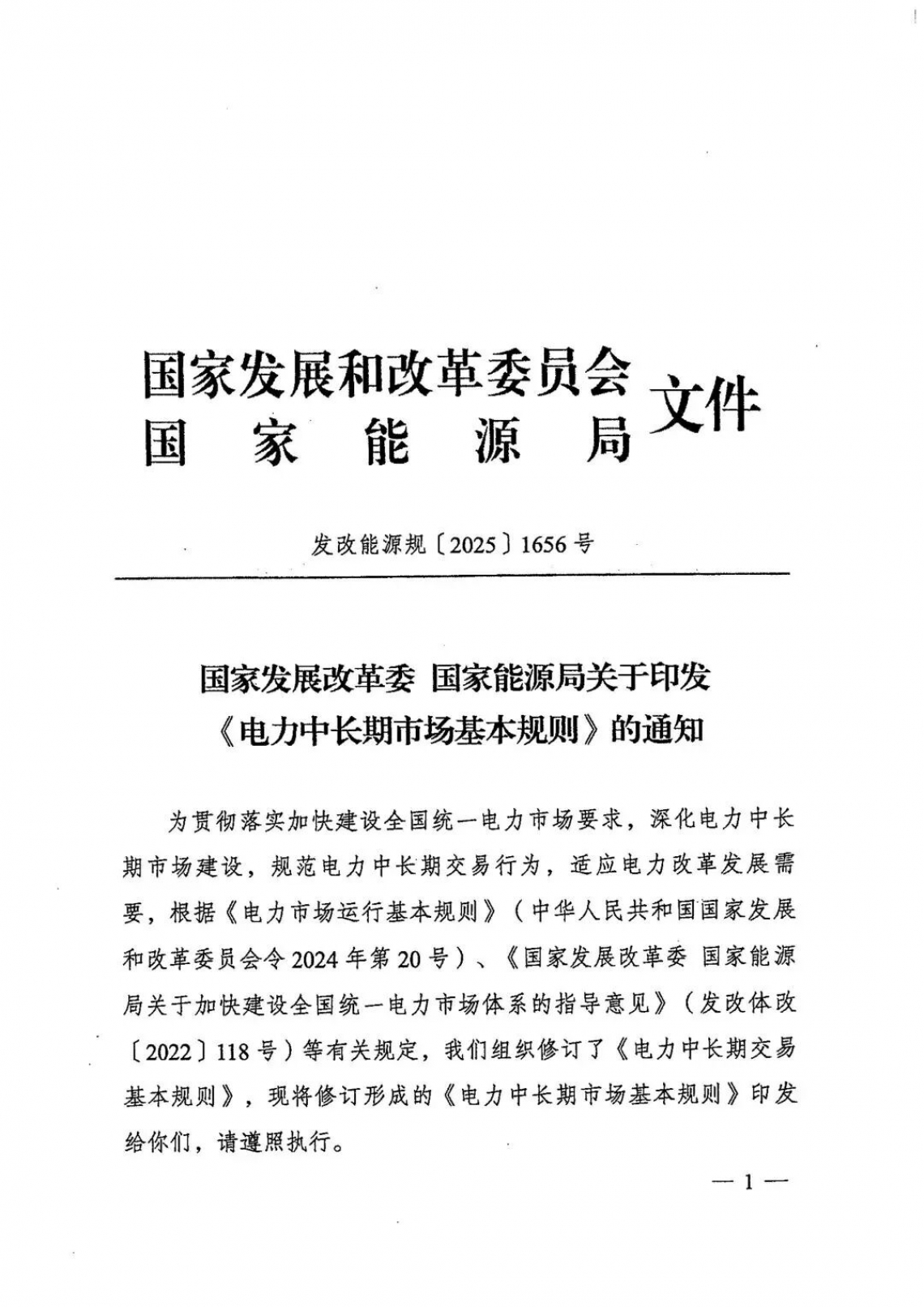 国家发展改革委、国家能源局近日发布关于印发《电力中长期市场基本规则》的通知(发改能源规〔2025〕1656号)。