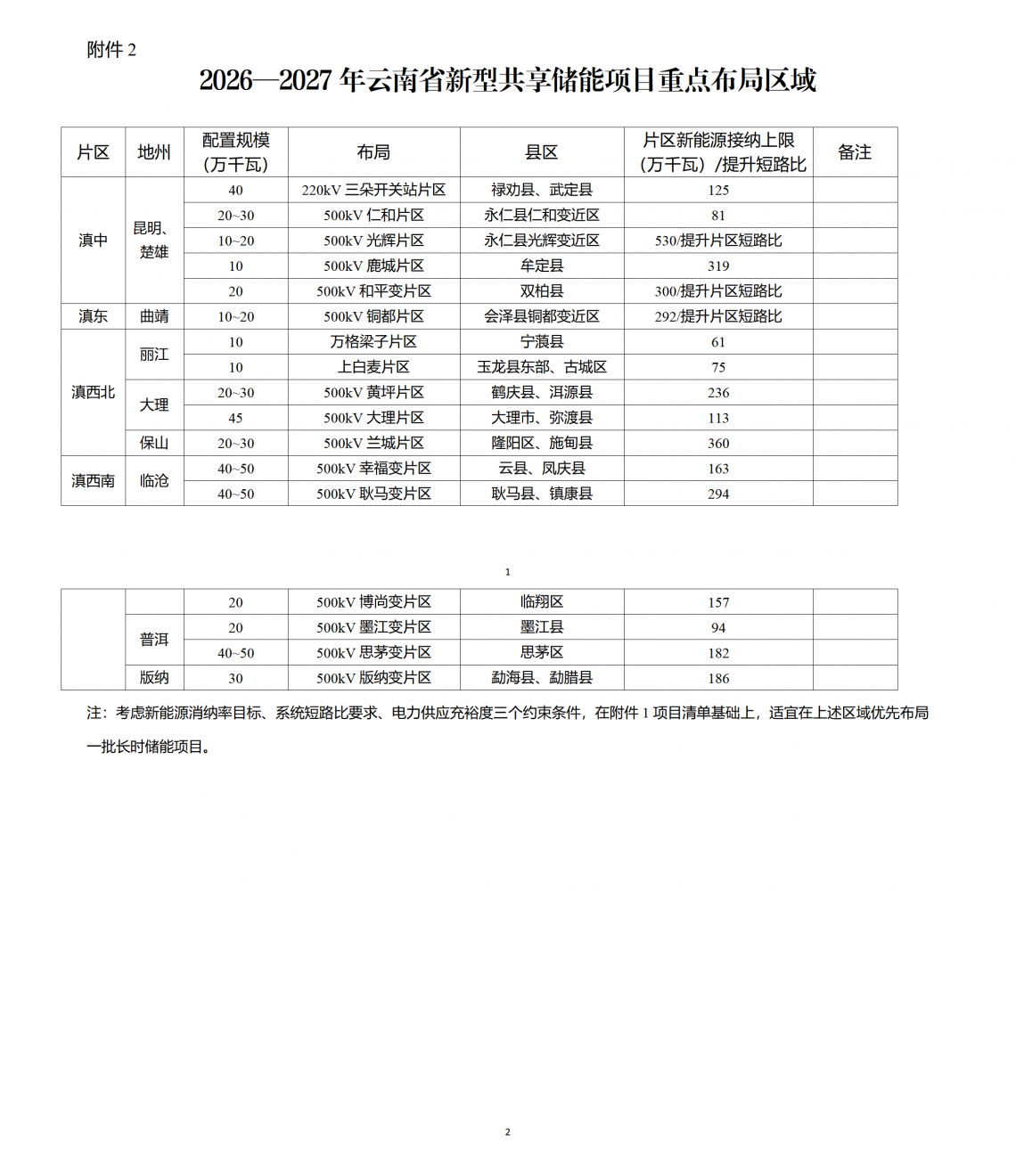 附件2:2026—2027年云南省新型共享储能项目重点布局区域