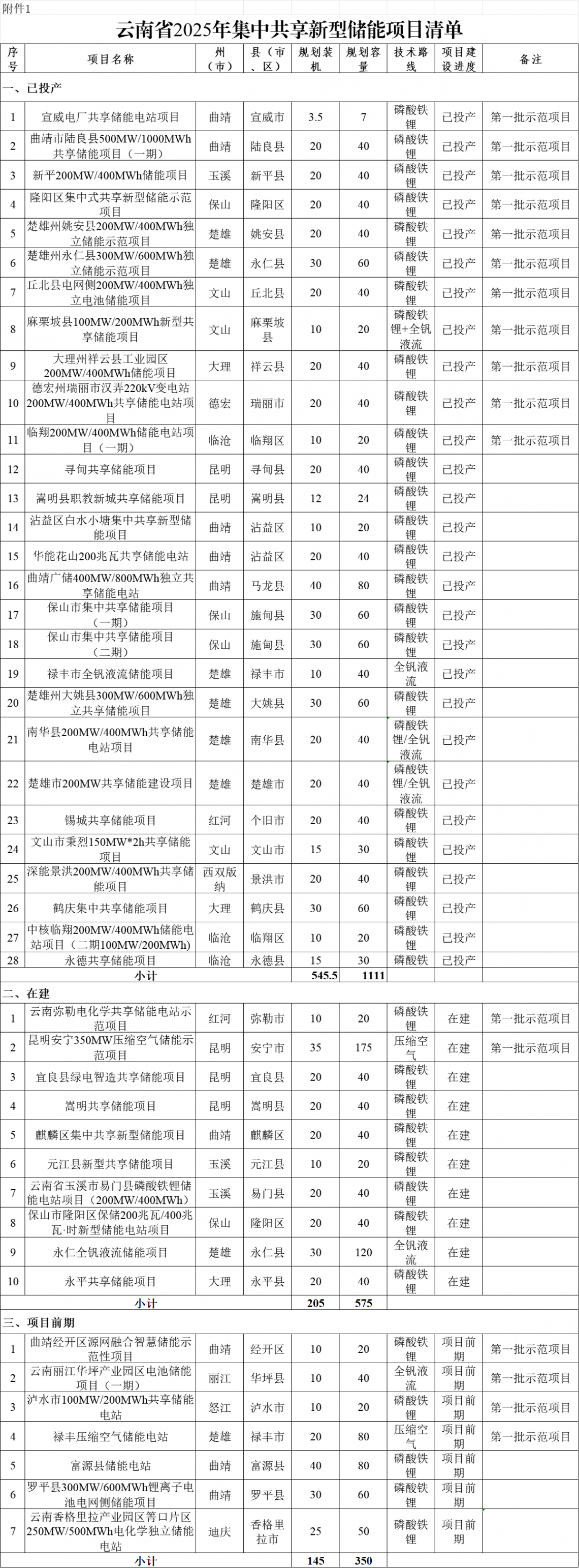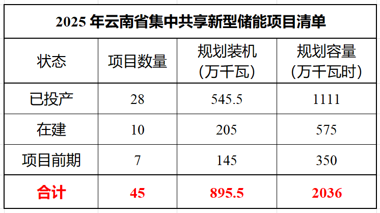 2025年,重点开展促进新能源消纳、提高电力系统稳定性的新型储能项目建设,形成《2025年云南省新型共享储能项目清单》,共45个项目,规模为895.5万千瓦/2036万千瓦时。
