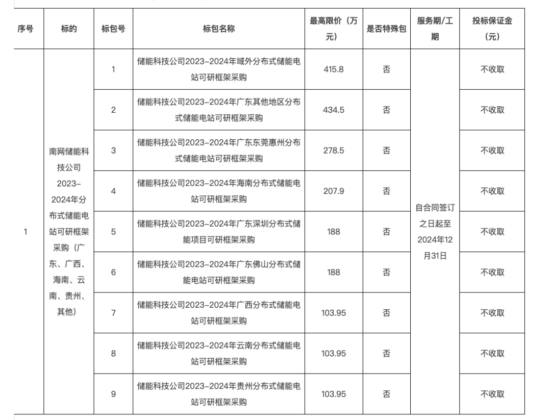 以下为公告原文:南网储能科技公司2023-2024年分布式储能电站可研框架采购(广东、广西、海南、云南、贵州、其他)招标公告(招标编号:CG0200022001607759) 南方电网储能股份有限公司就南网储能科技公司2023-2024年分布式储能电站可研框架采购(广东、广西、海南、云南、贵州、其他)向国内公开招标,凡有意参加投标的单位均可购买招标文件。