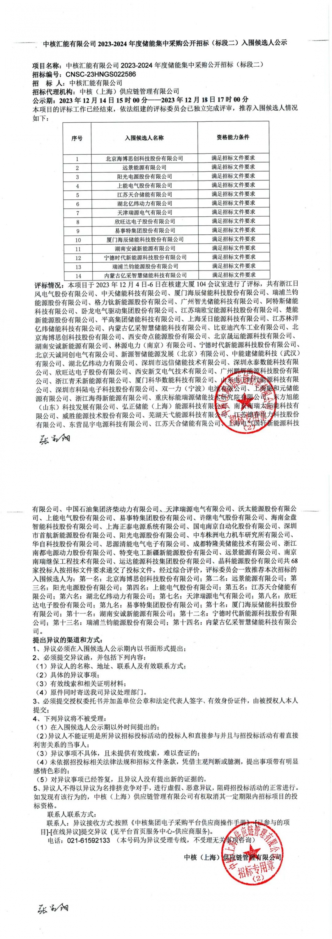 5GWh磷酸铁锂电池储能系统入围候选人: