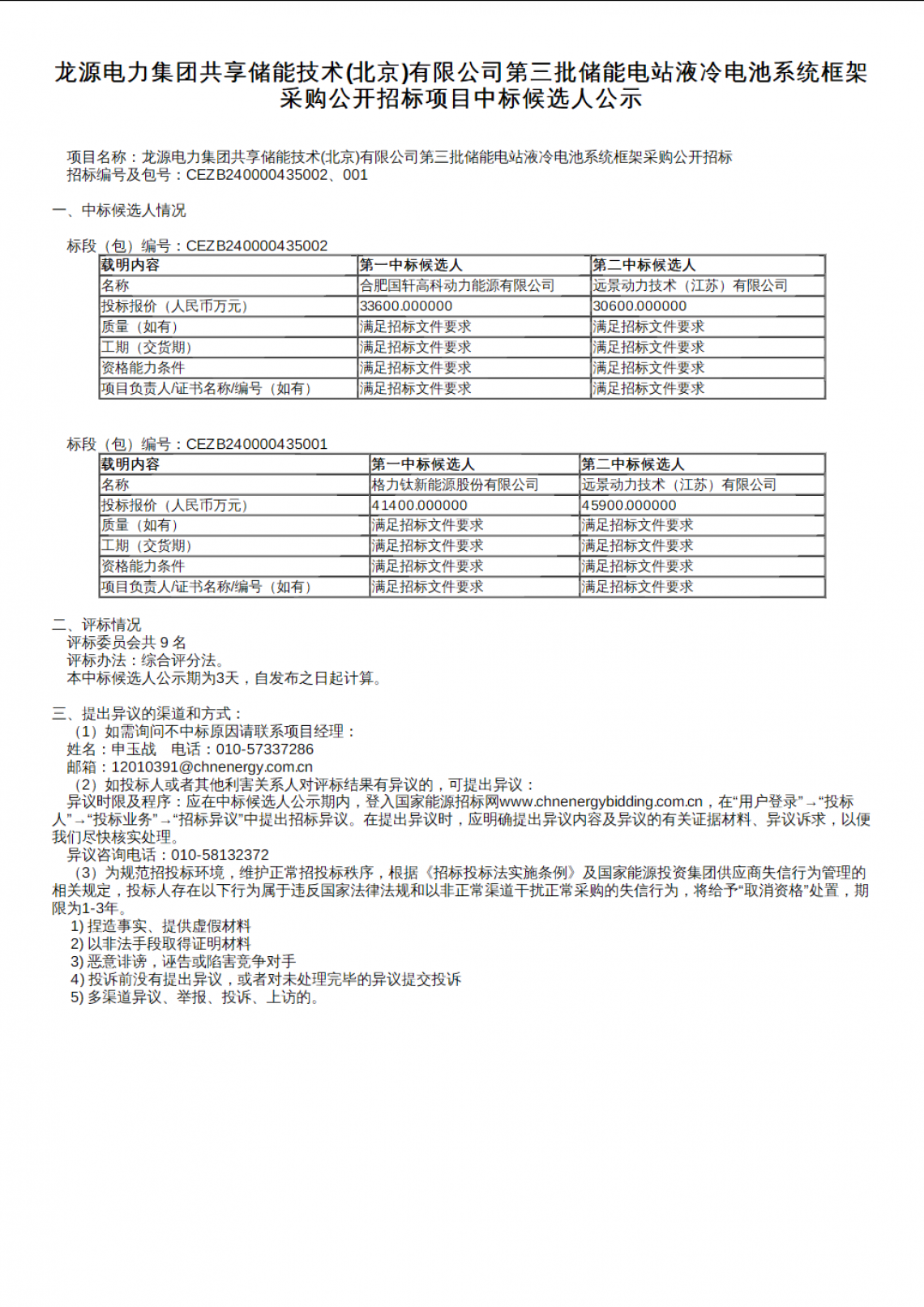 近日,龙源电力集团共享储能技术(北京)有限公司公示了第三批储能电站液冷电池系统框架采购招标项目中标候选人,中标价格在0.46~0.56元/Wh。
