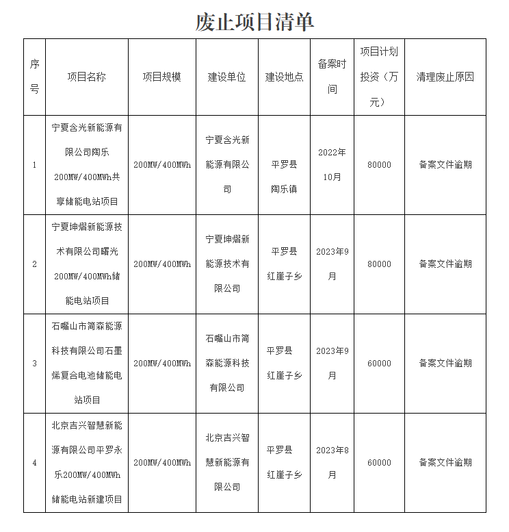 9月29日,宁夏石嘴山平罗县审批服务管理局发布废止新型储能项目的公告,共废止4个储能项目,共计800MW/1600MWh,废止原因为备案文件逾期。