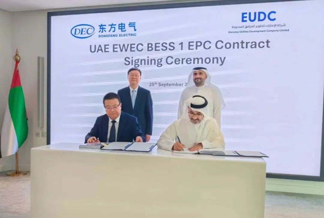 近日,在东方电气集团党组书记、董事长罗乾宜和阿联酋伊蒂哈德水电公司首席执行官优素福·阿里的共同见证下,东方国际党委书记、董事长陈强与阿联酋公用设施开发公司首席执行官默罕默德·谢赫在阿联酋能源部正式签署阿联酋BESS电池储能项目EPC总承包合同。该合同的成功签署,标志着东方国际正式进入阿联酋市场,为公司“绿色转型、效益优先”经营方针增添了最新落地成果。