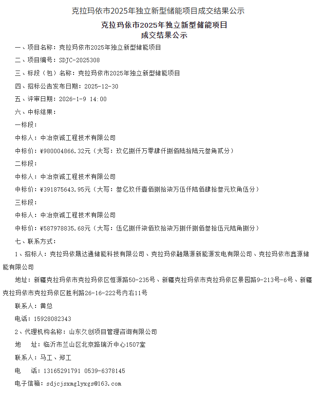 近日,克拉玛依市2025年独立新型储能项目成交结果公示。