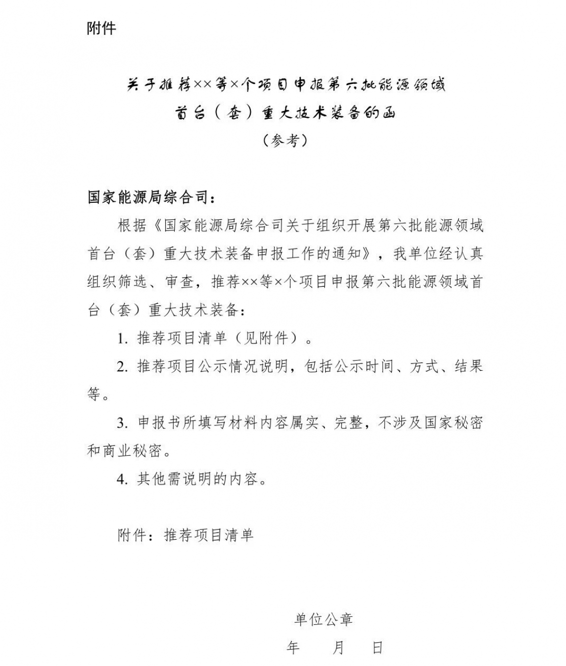附件:关于推荐××等×个项目申报第六批能源领域首台(套)重大技术装备的函(参考)