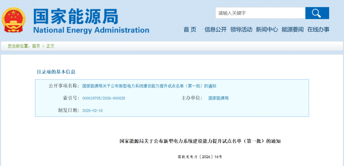 国家能源局关于公布新型电力系统建设能力提升试点名单(第一批)的通知