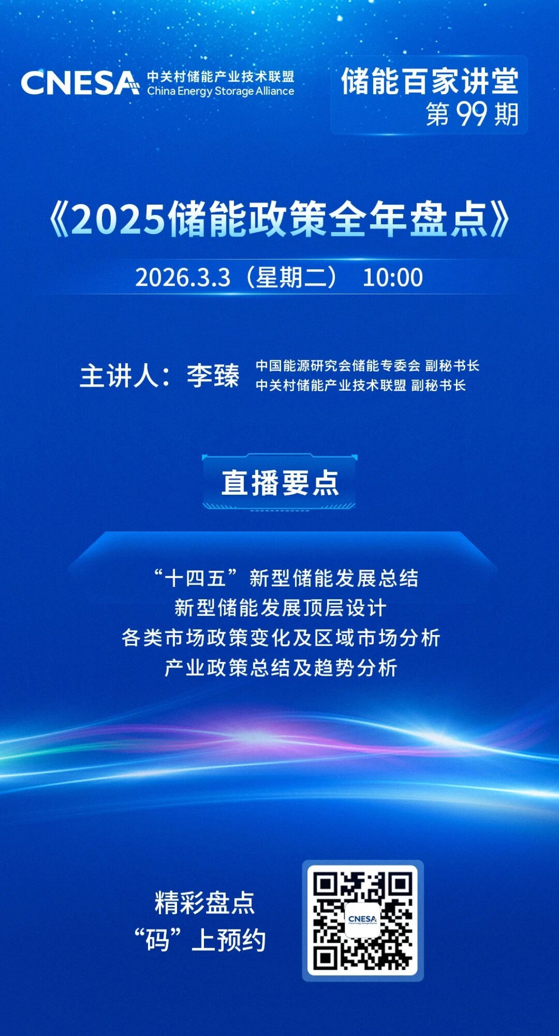 CNESA储能百家讲堂第99期聚焦“2025年国家及地方已发布的869项储能相关政策”,邀请中国能源研究会储能专委会 副秘书长、中关村储能产业技术联盟 副秘书长李臻作主讲嘉宾,将于2026年3月3日(星期二)上午10点隆重开讲。欢迎参加!